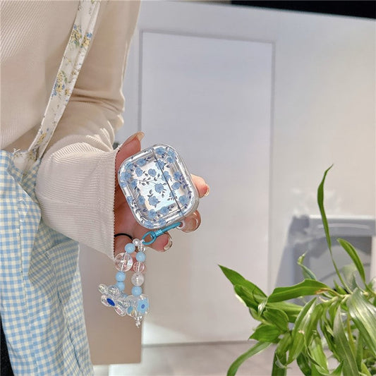 For AirPods Pro 2 / Pro Drop Protection TPU Cover Blue Flower Pattern TWS Earphone Case with Pendant