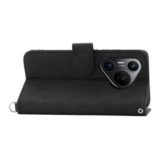 For Huawei Pura 70 Case Wallet Flower Pattern PU Leather Phone Cover with Crossbody Strap - Wine Red