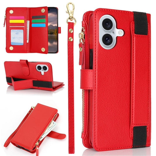 XL-001 For iPhone 16 Case Zipper Pocket Wristband Stand Leather Phone Cover - Red