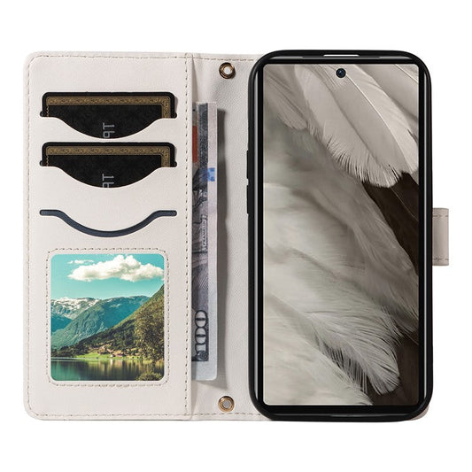 For Google Pixel 7a Case Wallet Rhombus Leather Phone Cover with Shoulder Strap, Wrist Strap - White