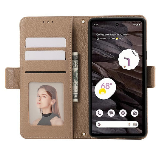 For Google Pixel 7a Leather Case with Card Holder, Straps, Shockproof Wallet Phone Cover - Grey Blue