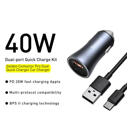 BASEUS Golden Contactor Pro 40W Max Type C + Type-C Dual Ports Fast Charging Car Charger - Dark Grey