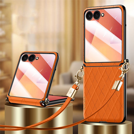 SULADA For Samsung Galaxy Z Flip7 5G Case Rhombus Leather+PC Phone Cover with Shoulder Strap - Black