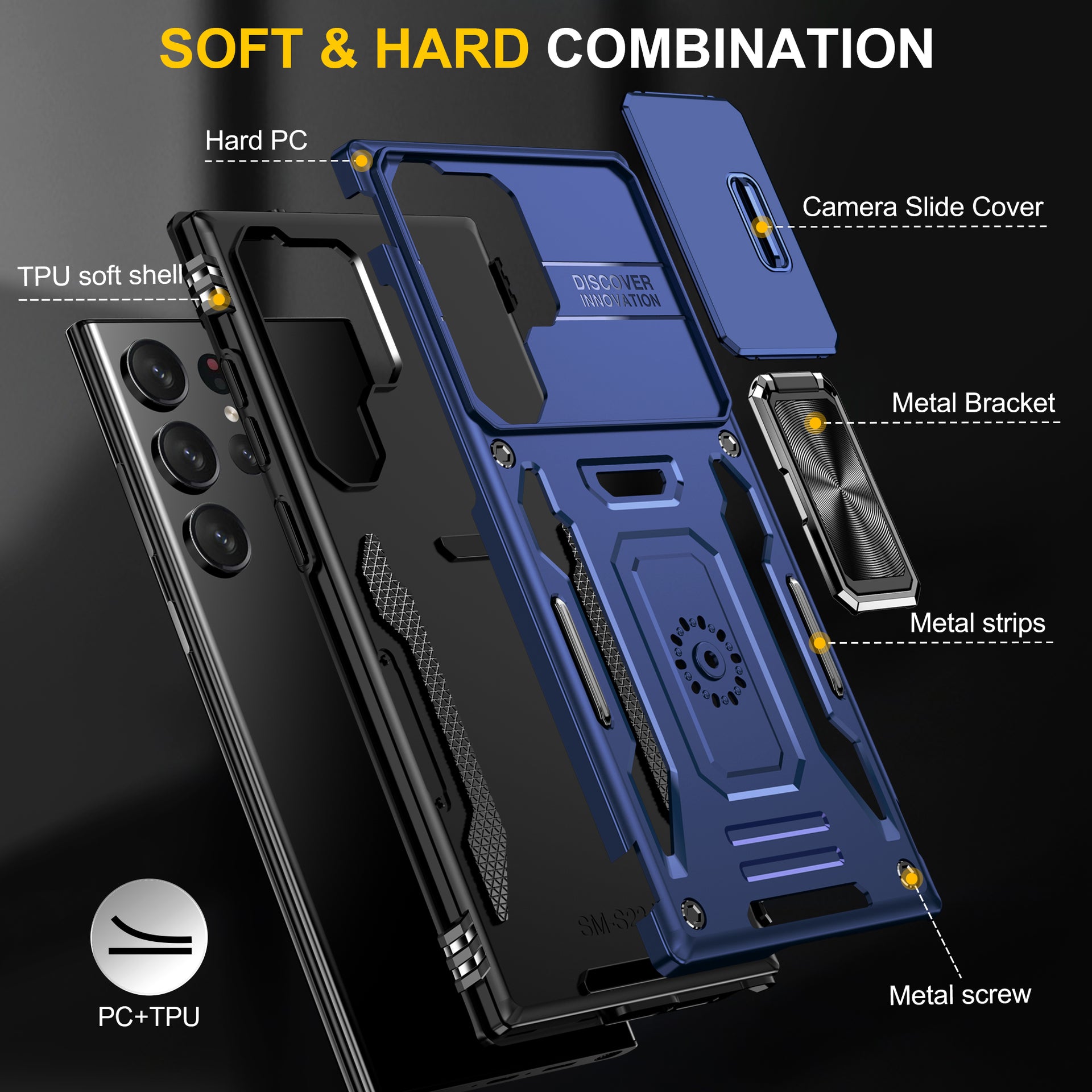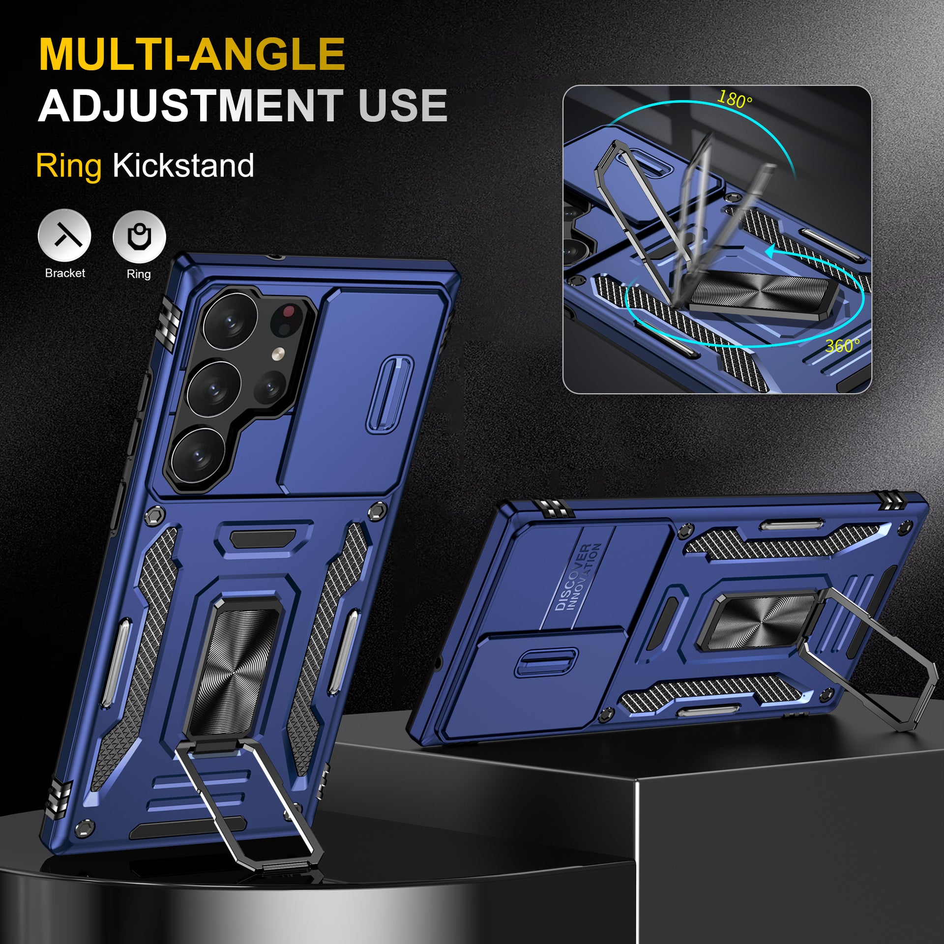 Armor Series For Samsung Galaxy S24 Ultra Case Slide Lens Protection Shockproof PC+TPU Kickstand Phone Cover - Navy Blue