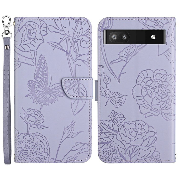 Butterfly Flowers Imprinting Fingerprint Free PU Leather Phone Shell for Google Pixel 6a, Pattern Imprinting Design Wallet Stand Case with Handy Strap - Light Purple