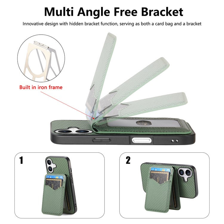 C1-14 For iPhone 16 Case Carbon Fiber Texture Leather+TPU Kickstand Phone Cover Detachable Card Holder - Green