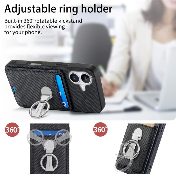 C1-9 For iPhone 16 Case Kickstand Leather Card Slots Back Cover Carbon Fiber Texture - Blue