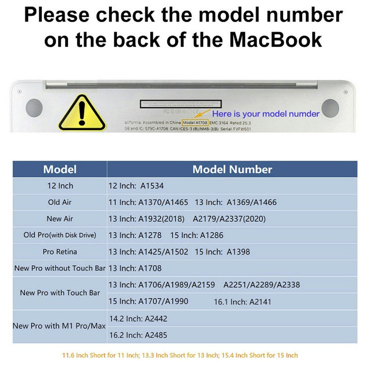 Note: Please kindly check the model number "Axxxx" on the back of the laptop before your purchase. And confirm the regional version of your MacBook.