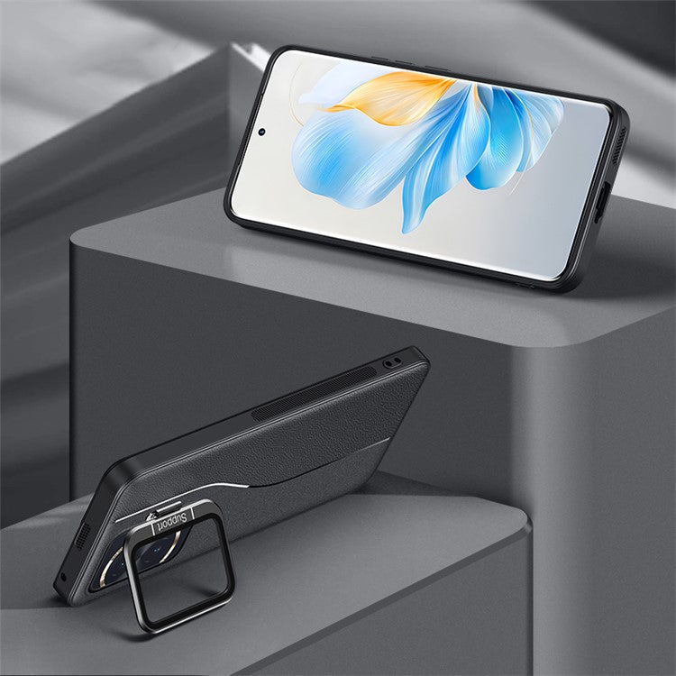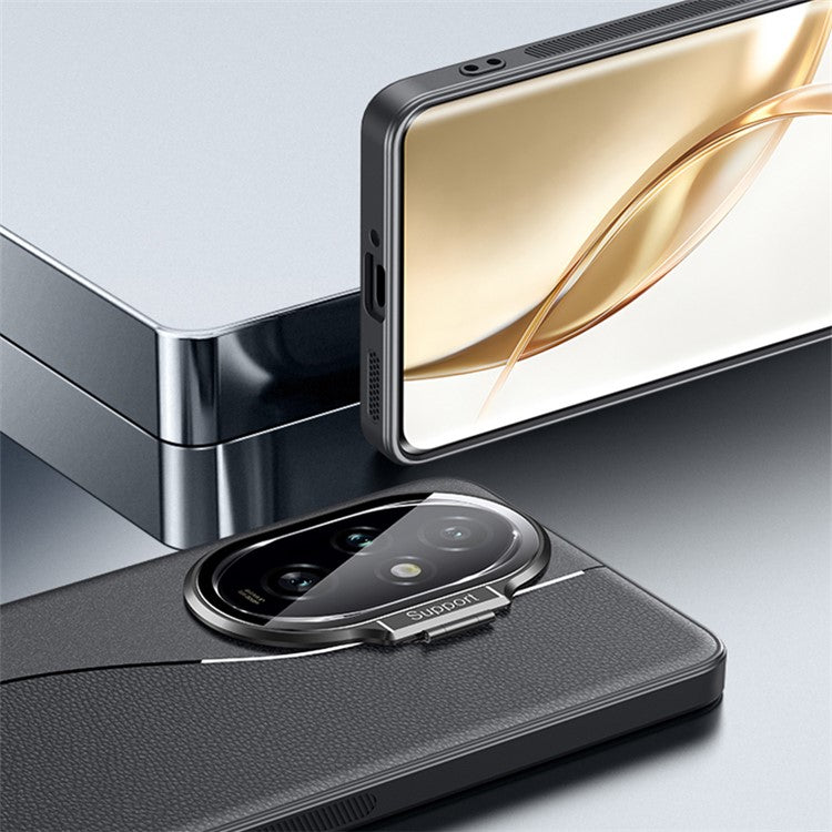 For Honor 100 5G Case Camera Cover Kickstand Leather+TPU+PC Anti-Drop Phone Cover - Black