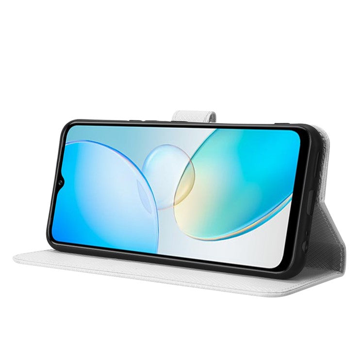 For Infinix Hot 12 Pro 4G X668C PU Leather Flip Folio Case Diamond Texture Stand Soft TPU Inner Shell Phone Cover with Strap - White