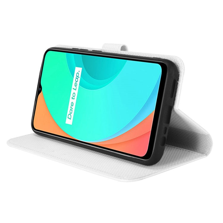 For Realme C11 Diamond Texture Phone Case Cover PU Leather Anti-scratch Wallet Stand Cell Phone Shell with Strap - White
