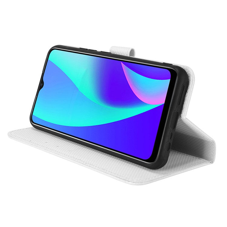 For Realme C15 Diamond Texture Magnetic Clasp Phone Case Cover PU Leather Wallet Stand Cell Phone Shell with Strap - White