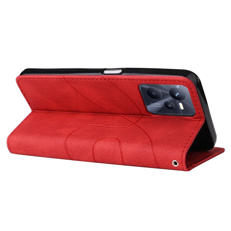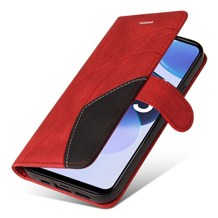 For Realme C35 4G Dual-color Splicing PU Leather Well-protected Folio Flip Wallet Style Phone Case Stand Shell with Strap - Red