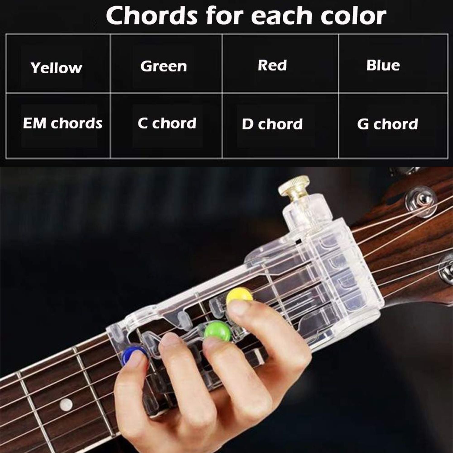 Features:Folk guitar chord practice assisted tool designed for beginners.4 chord buttons: yellow--EM chord green--C chord red--D chord blue--G chord.Simple to use just press the button you can play the chord easily and reduce finger pain.High-quality plastic material lightweight and durable convenient to carry around.Not suitable for left-handed 12-string classical and half-sized(Children's) guitars. Please measure your guitar neck before ordering.Specifications:Material: PlasticItem Size: 12.5 * 7.5 * 3.8cm/ 4.9 * 3 * 1.5inItem Weight: 47g/ 1.7ozPacking List:1 * Chord Trainer