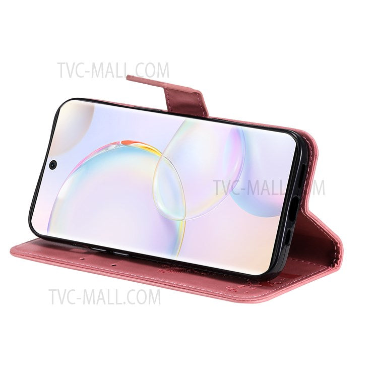 KT Imprinting Flower Series-3 Cat and Tree Pattern Imprinted Wallet Flip Cover PU Leather Stand Magnetic Clasp Shockproof Protection Case for Huawei nova 9 / Honor 50 - Pink