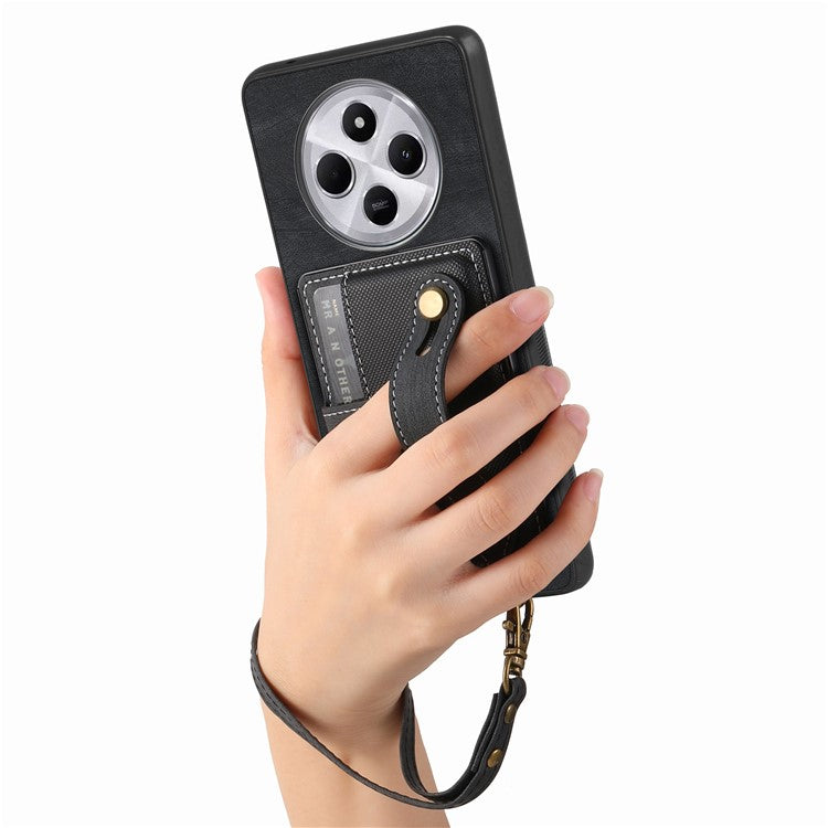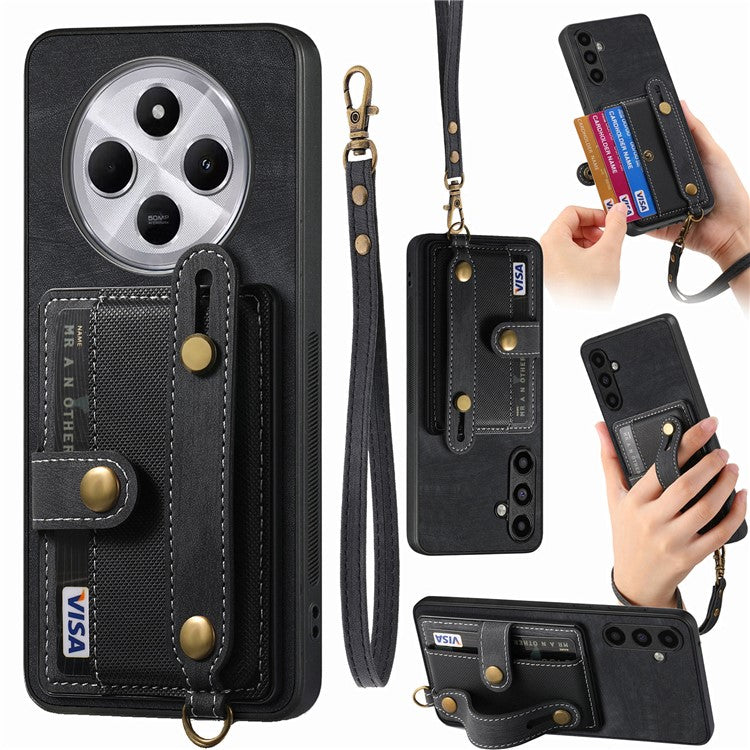 Phone Case For Xiaomi Redmi 14C 4G / 14R 5G / Poco C75 4G Wristband Kickstand PU Leather Retro Back Cover Card Holder - Black