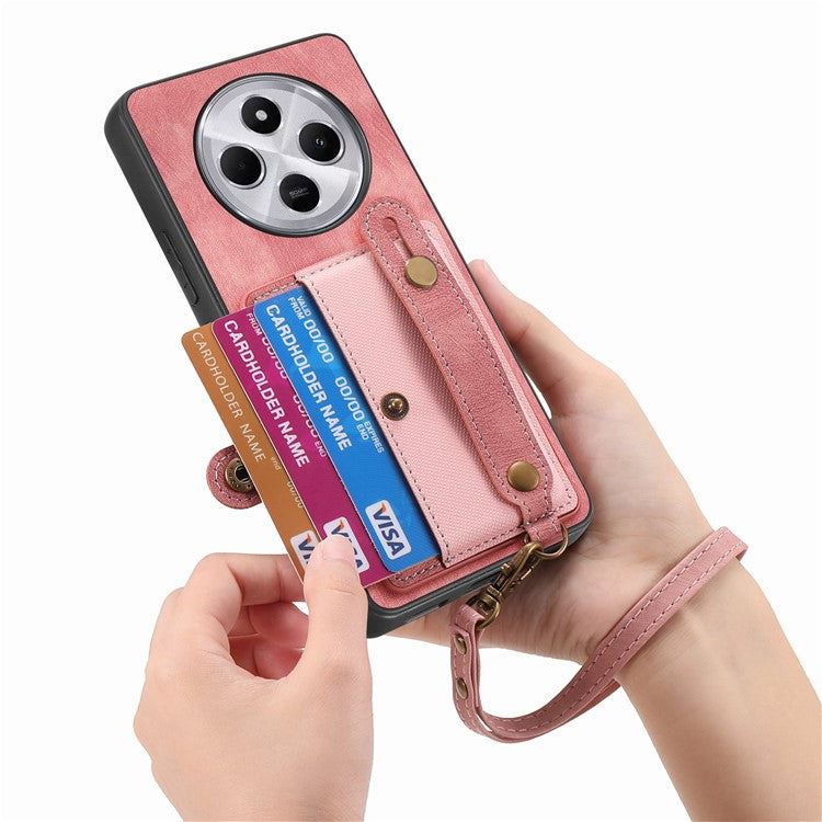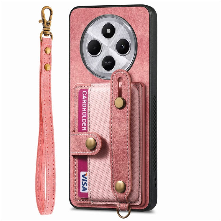 Phone Case For Xiaomi Redmi 14C 4G / 14R 5G / Poco C75 4G Wristband Kickstand PU Leather Retro Back Cover Card Holder - Pink