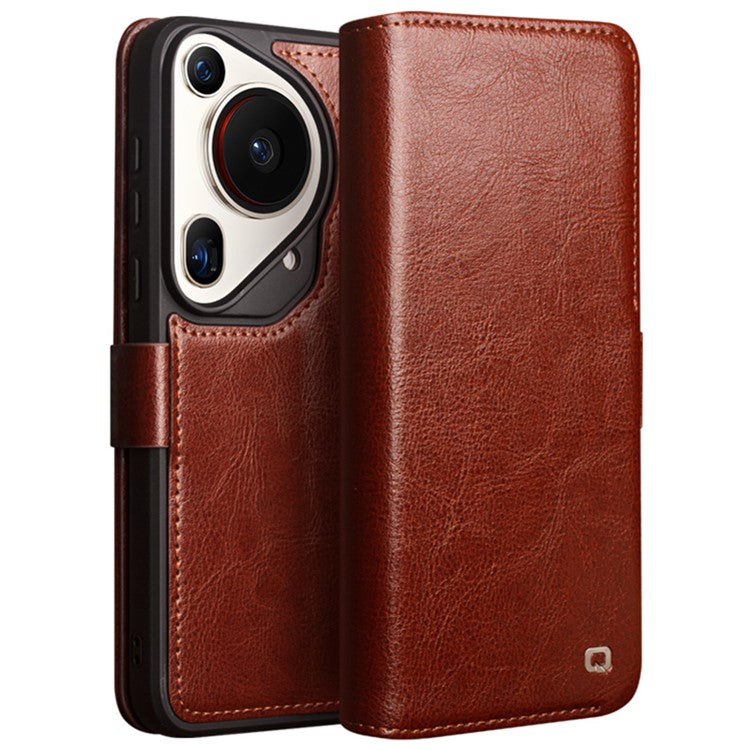 QIALINO For Huawei Pura 70 Ultra Wallet Case Genuine Cow Leather Flip Phone Cover - Dark Brown