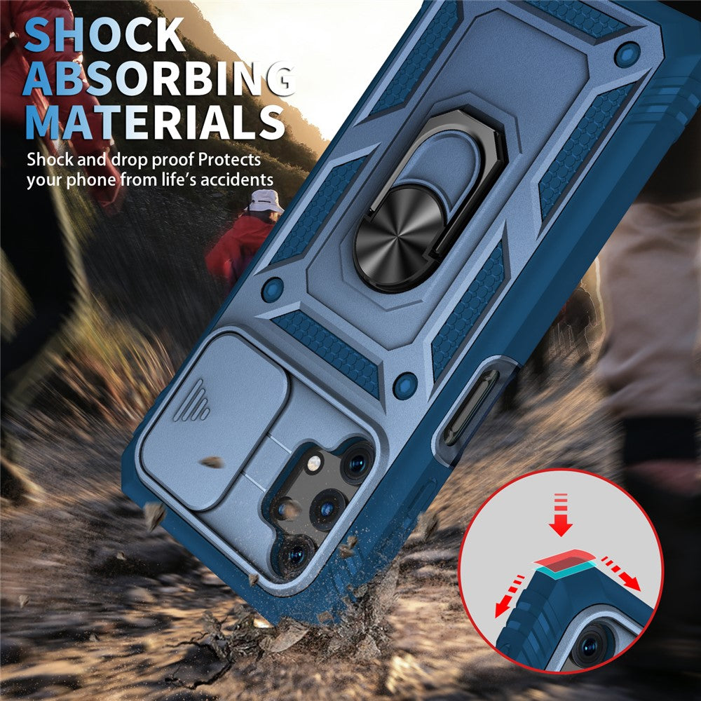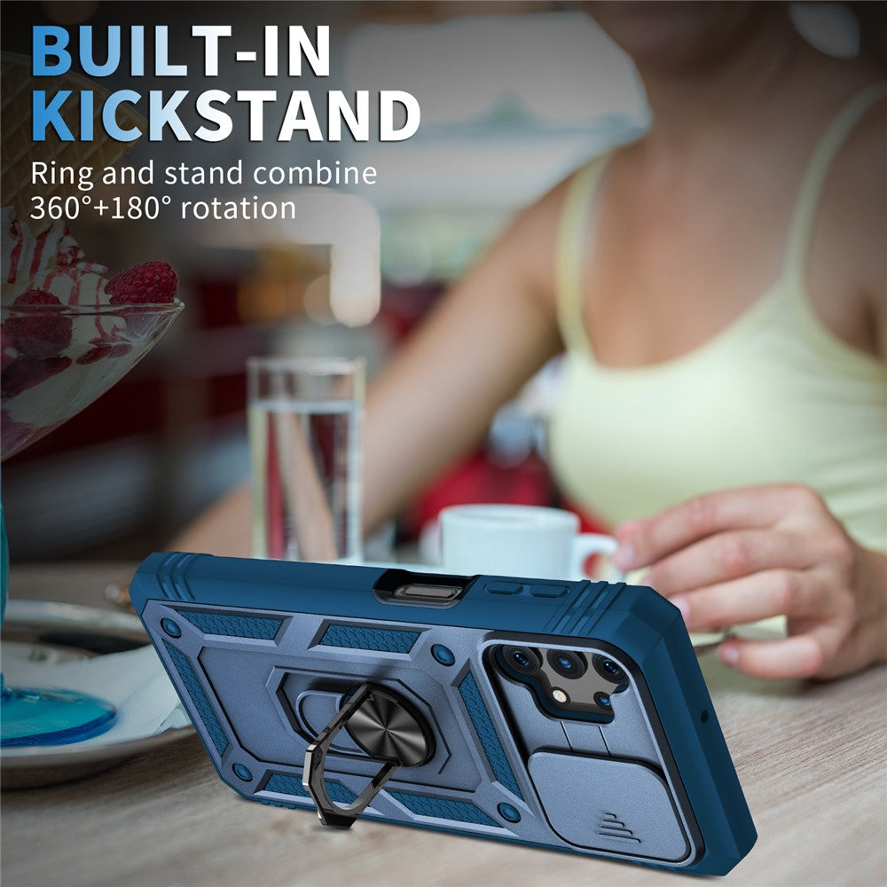 Slide Camera Protector PC + TPU Phone Case Shell with Kickstand and Card Slot for Samsung Galaxy A32 5G/M32 5G - Blue