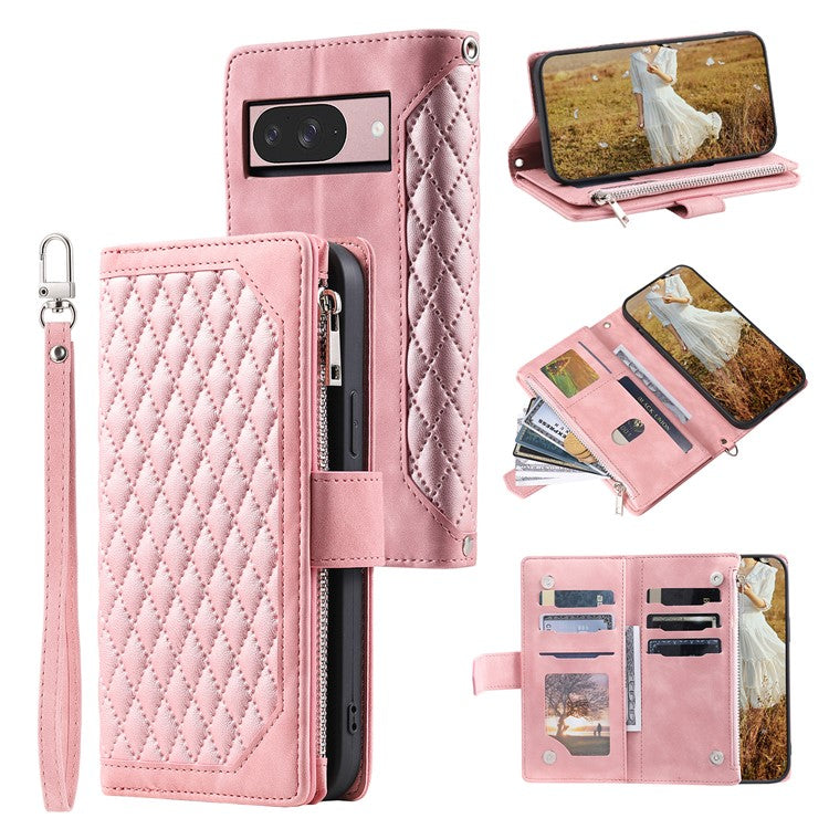 Style 005 For Google Pixel 9 / 9 Pro Wallet Case Rhombus PU Leather Zipper Phone Cover - Rose Gold