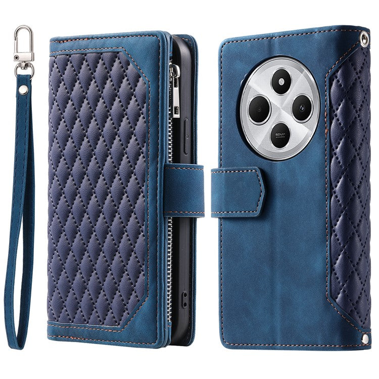 Style 005 For Xiaomi Poco C75 4G / Redmi 14R 5G / 14C 4G Zipper Wallet Case Rhombus Stitching Line PU Leather Phone Cover - Blue
