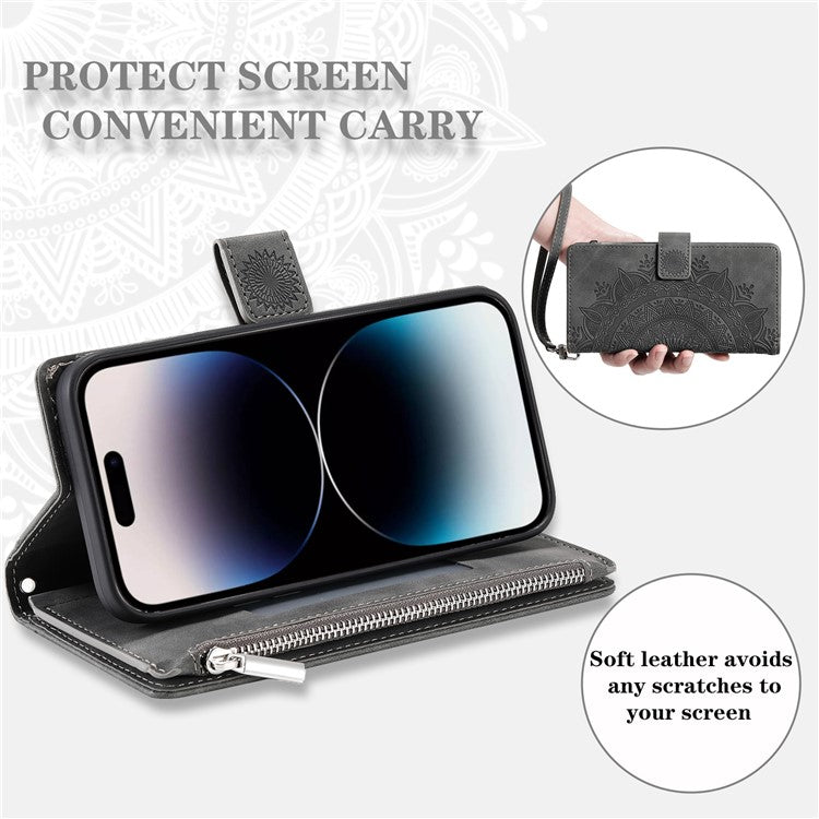 Style 006 For iPhone 16 Case PU Leather Wallet Phone Cover Mandala Flower Pattern - Grey