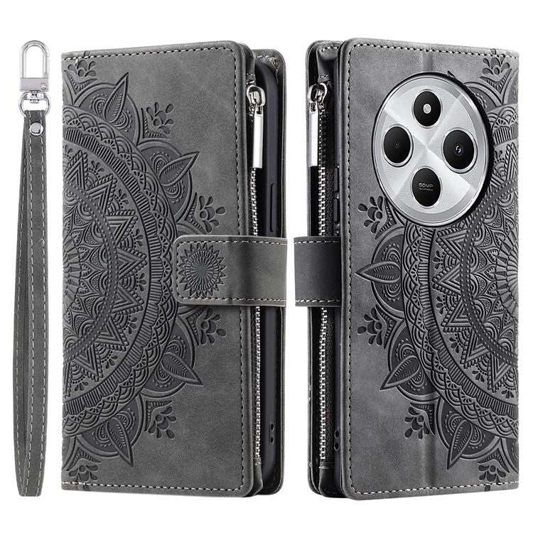 Style 006 For Xiaomi Poco C75 4G / Redmi 14R 5G / 14C 4G Case Mandala Flower Pattern PU Leather Zipper Wallet Phone Cover - Grey