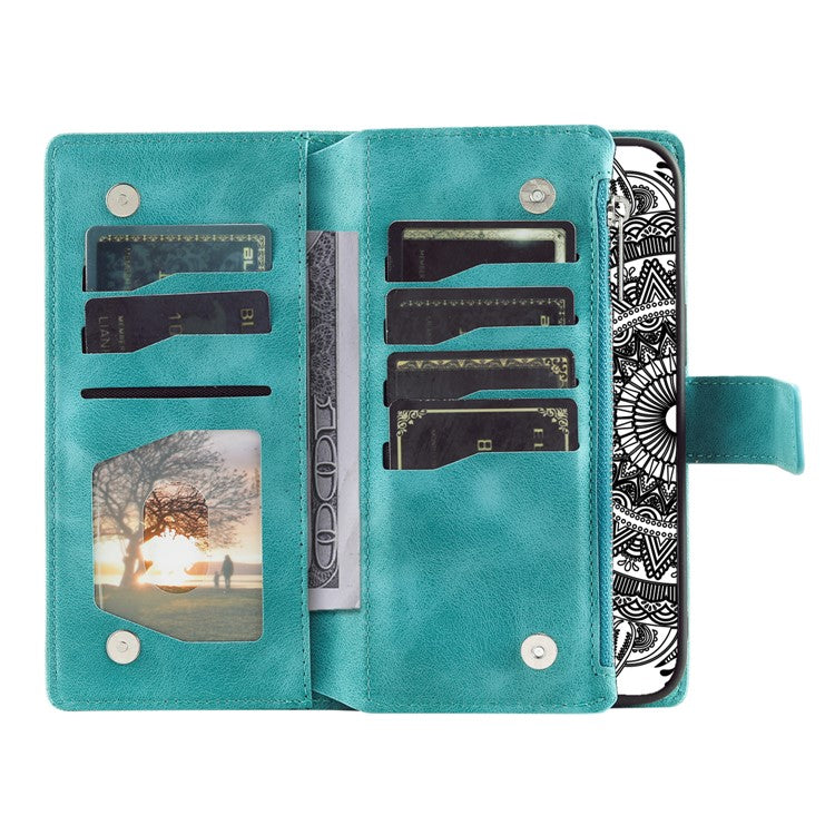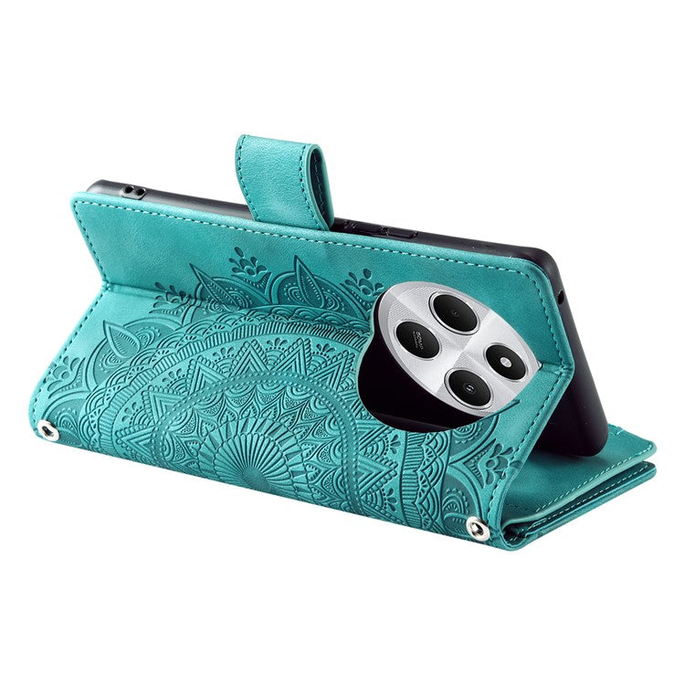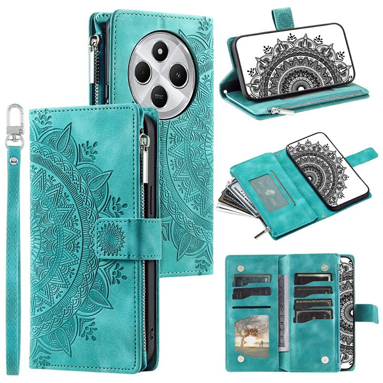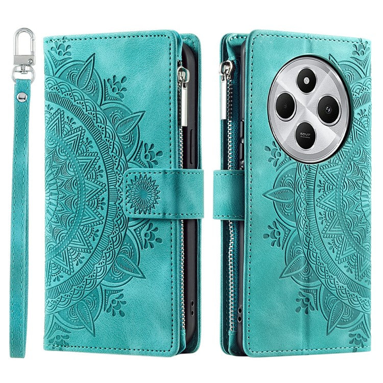 Style 006 For Xiaomi Poco C75 4G / Redmi 14R 5G / 14C 4G Case Mandala Flower Pattern PU Leather Zipper Wallet Phone Cover - Mint Green