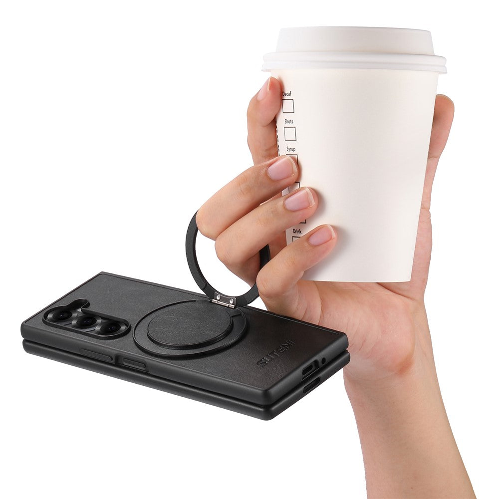 SUTENI G3 For Samsung Galaxy Z Fold7 5G Case Compatible with MagSafe Waxy Texture Rotating Kickstand Leather Phone Back Cover - Black