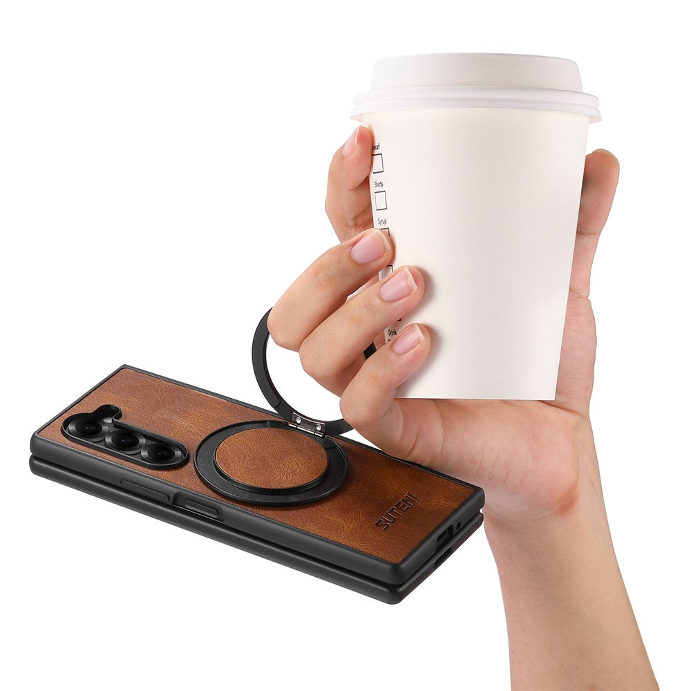 SUTENI G3 For Samsung Galaxy Z Fold7 5G Case Compatible with MagSafe Waxy Texture Rotating Kickstand Leather Phone Back Cover - Brown
