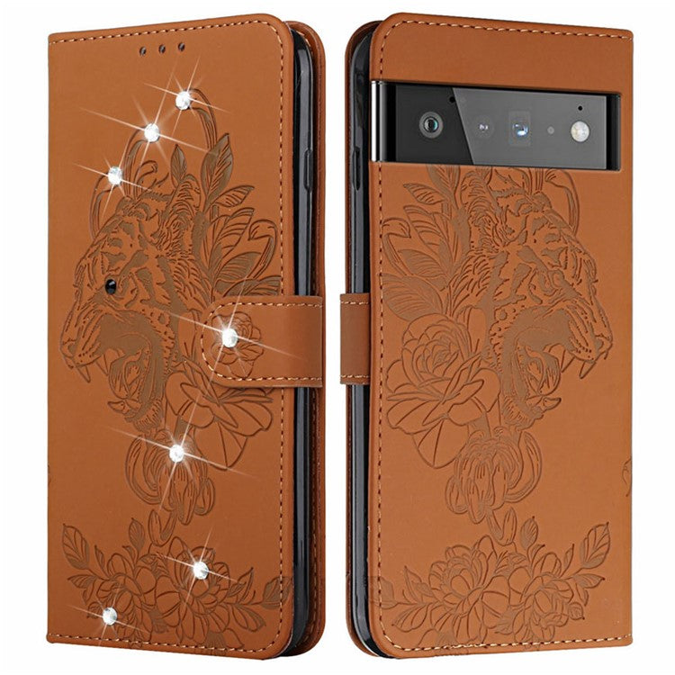 Tiger Head Imprinted Rhinestone Design Wallet Stand Leather Protective Phone Case Shell for Google Pixel 6 Pro - Brown