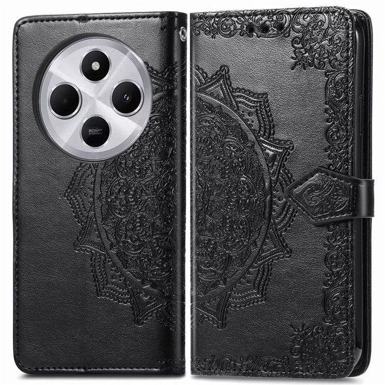 Wallet Phone Case For Xiaomi Redmi 14C 4G / 14R 5G / Poco C75 4G Mandala Flower Leather Phone Cover Stand View - Black