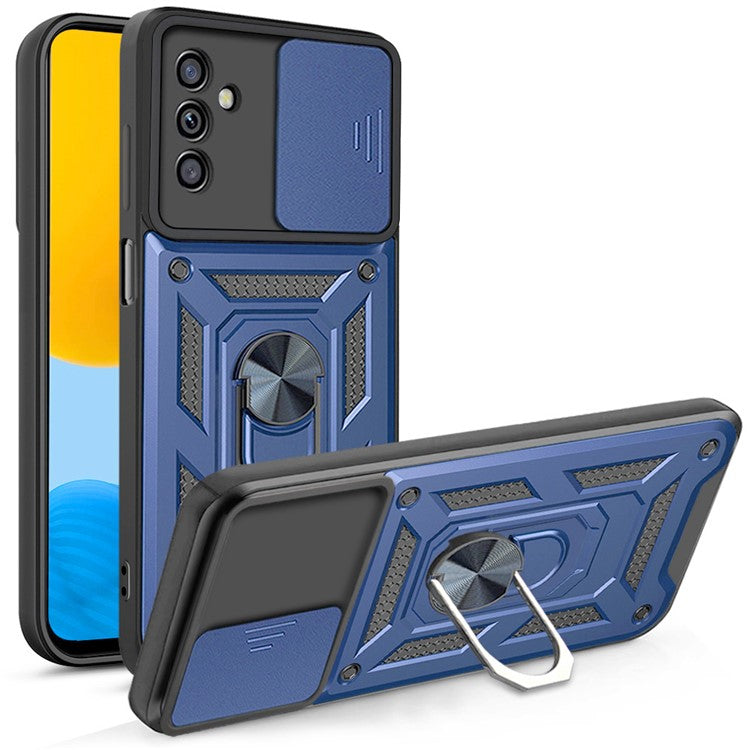 Well-protected Drop-proof Camera Slide Cover Ring Holder Kickstand Design PC + TPU Phone Cover Case for Samsung Galaxy M52 5G - Blue