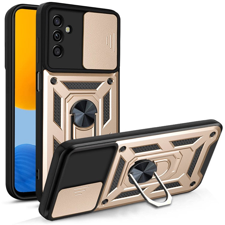 Well-protected Drop-proof Camera Slide Cover Ring Holder Kickstand Design PC + TPU Phone Cover Case for Samsung Galaxy M52 5G - Gold