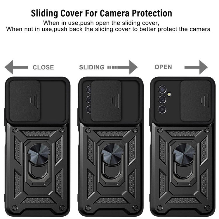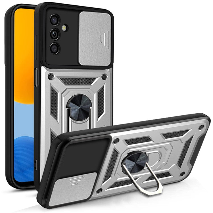 Well-protected Drop-proof Camera Slide Cover Ring Holder Kickstand Design PC + TPU Phone Cover Case for Samsung Galaxy M52 5G - Silver