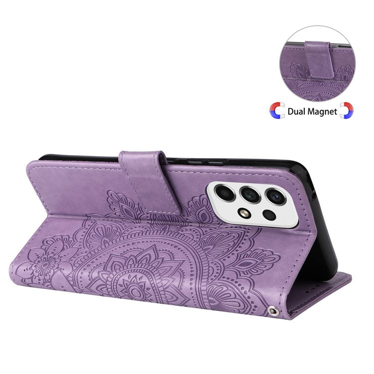 Well-protected Imprinting Flower Double-sided Magnetic Clasp PU Leather Stand Wallet Phone Case Cover with Hand Strap for Samsung Galaxy A53 5G - Purple