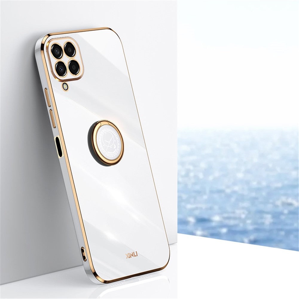XINLI For Samsung Galaxy M33 5G (Global Version) Precise Lens Cutout Phone Case with Ring Kickstand Electroplating Golden Edge Bump Proof TPU Cover - White