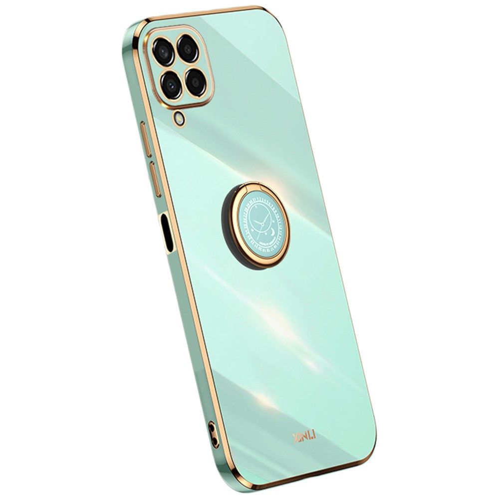 XINLI For Samsung Galaxy M53 5G Electroplating Golden Edge Soft TPU Cover Precise Lens Cutout Phone Case with Ring Kickstand - Cyan