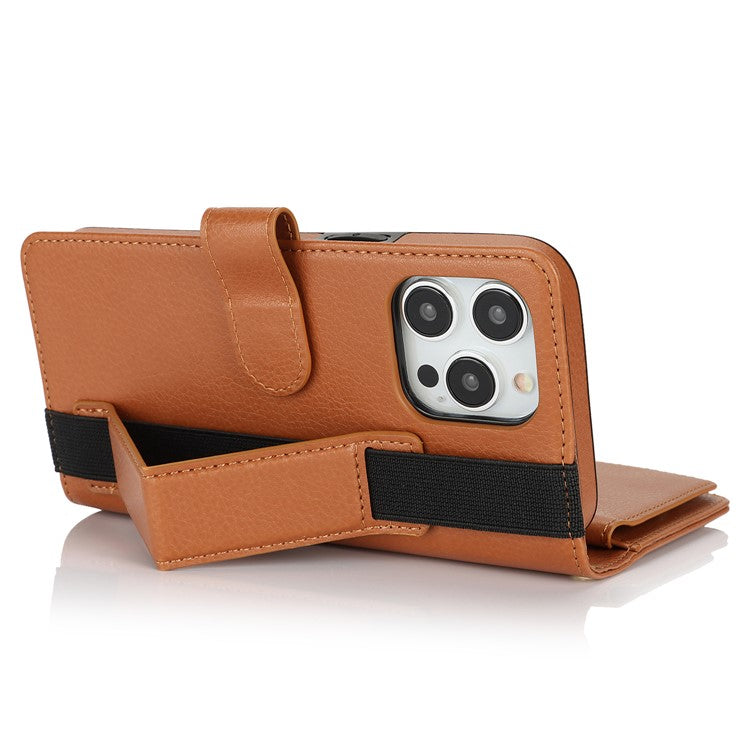 XL-001 For iPhone 16 Pro Max Case Zipper Pocket Wristband Stand Leather Phone Cover - Brown