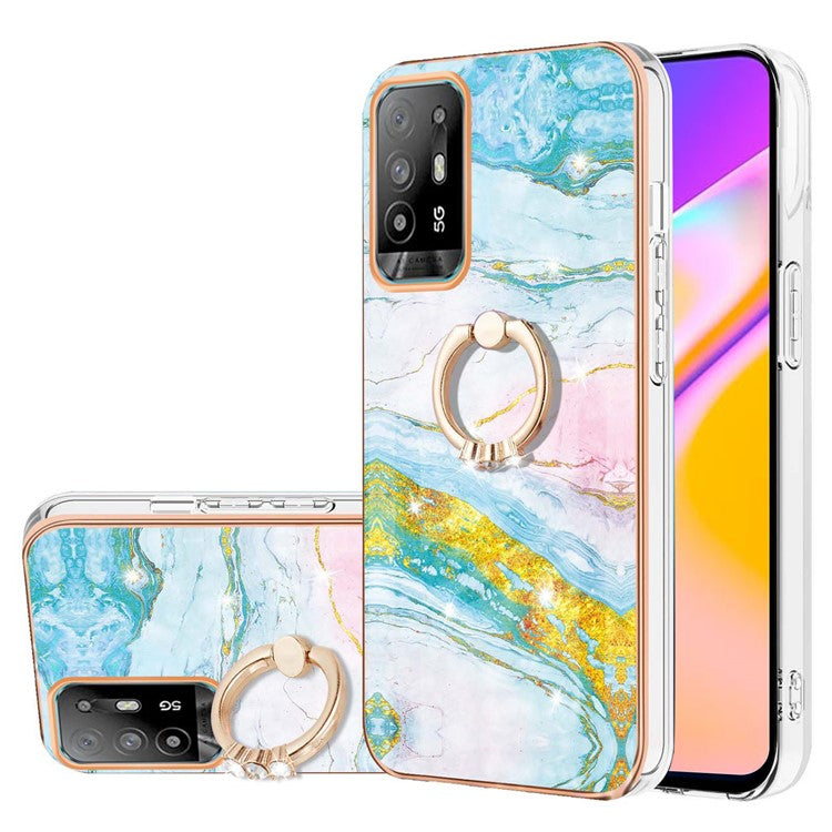 YB IMD Series-10 for Oppo A94 5G/A95 5G Light Slim IMD Rotating Ring Kickstand Design Marble Pattern Electroplating Frame TPU Soft Phone Case Shell - Green 004