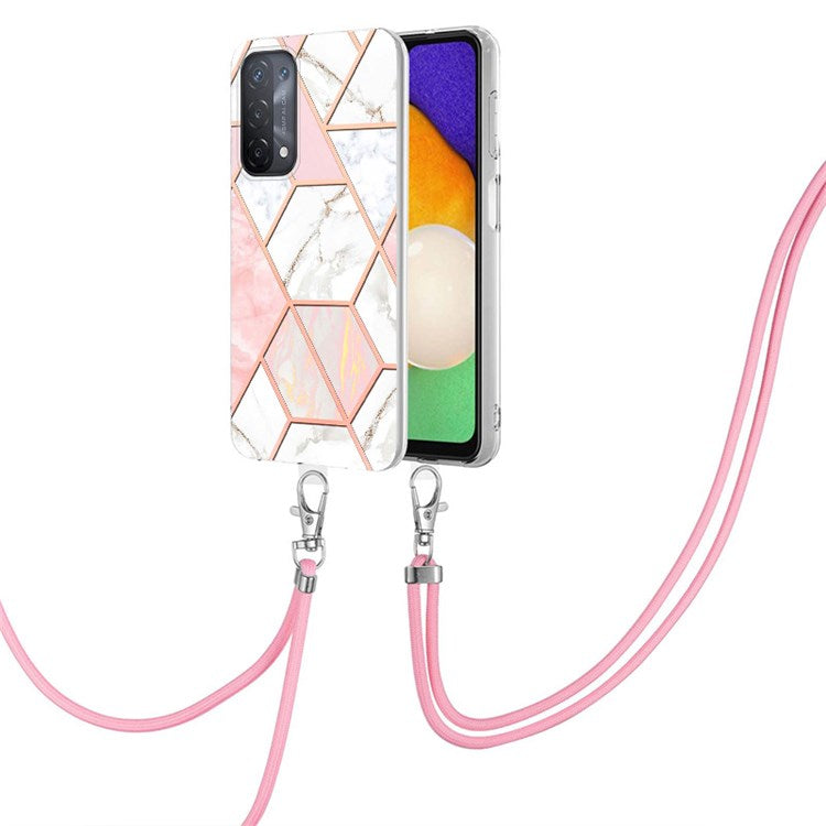 YB IMD Series-5 Slim Lightweight TPU Phone Cover for Oppo A74 5G/A93 5G/A54 5G/A93s 5G, Shiny Electroplating Effect IMD IML Marble Pattern Phone Flexible Case with Adjustable Lanyard - Pink/White