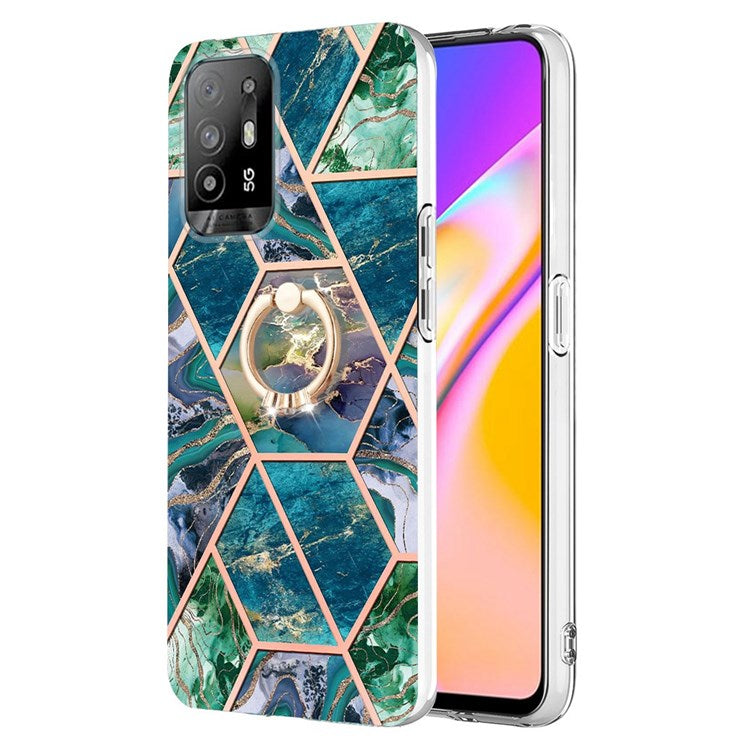 YB IMD Series-7 for Oppo A94 5G/A95 5G Electroplating Phone Case Marble Pattern IMD Shockproof TPU Smartphone Cover with Ring Kickstand - Blue/Green