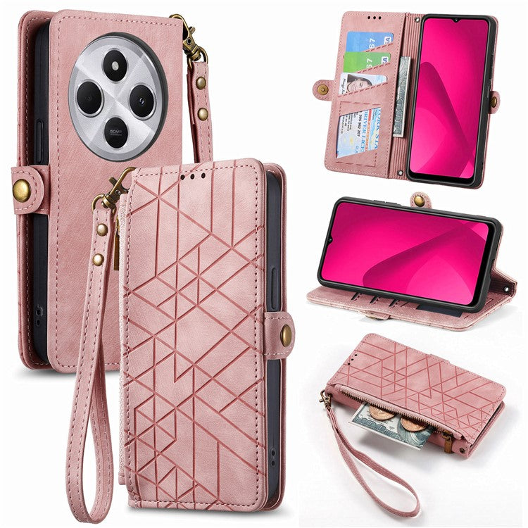 Zipper Phone Case For Xiaomi Redmi 14C 4G / 14R 5G / Poco C75 4G Wallet Geometry Lines Leather Phone Cover - Pink