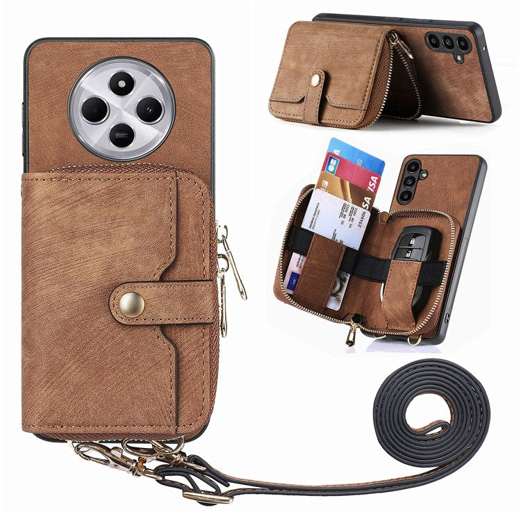 Zipper Wallet Phone Case For Xiaomi Redmi 14C 4G / 14R 5G / Poco C75 4G Leather Kickstand Back Cover with Shoulder Strap - Brown