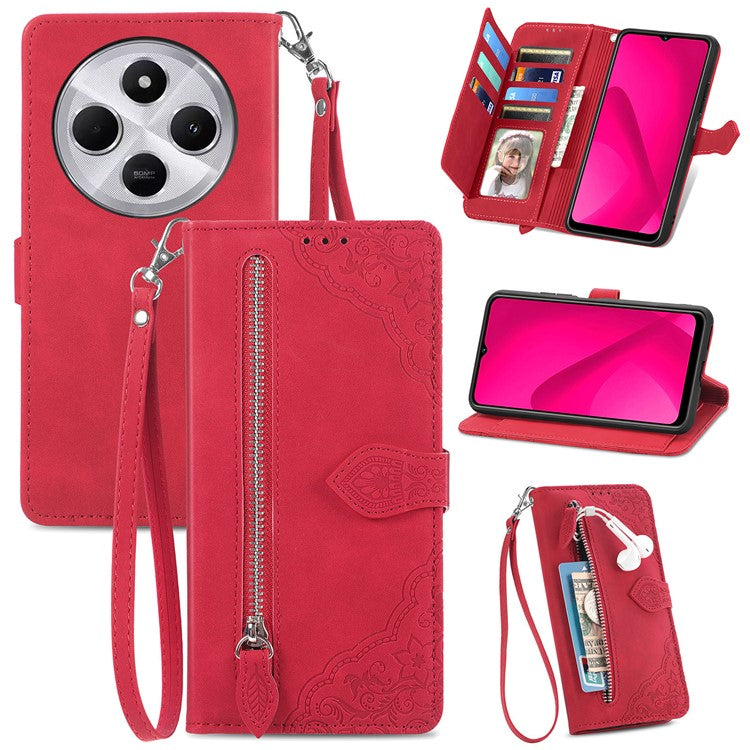 Zipper Wallet Phone Case For Xiaomi Redmi 14C 4G / 14R 5G / Poco C75 4G PU Leather Flower Imprint Phone Cover - Red