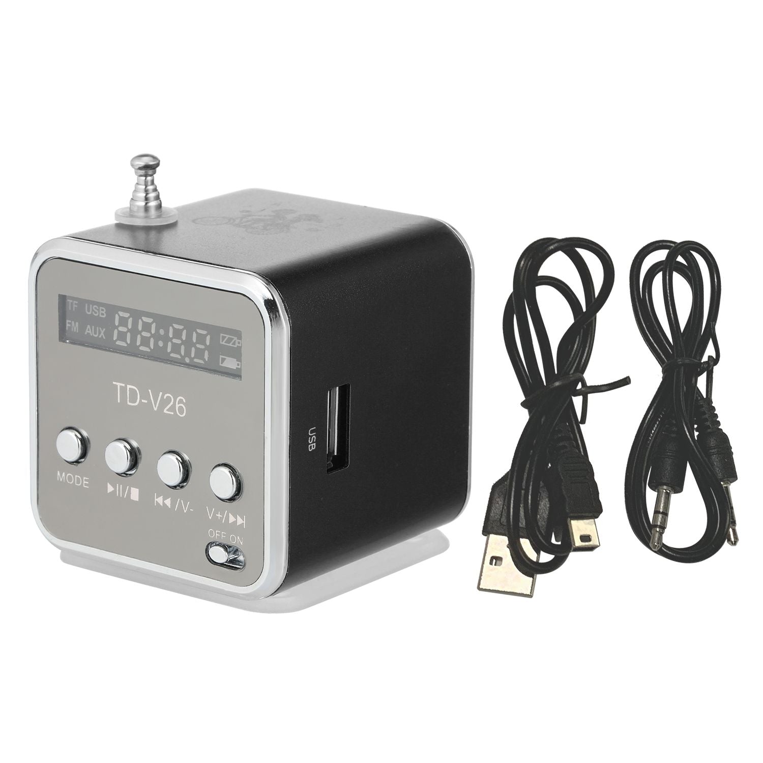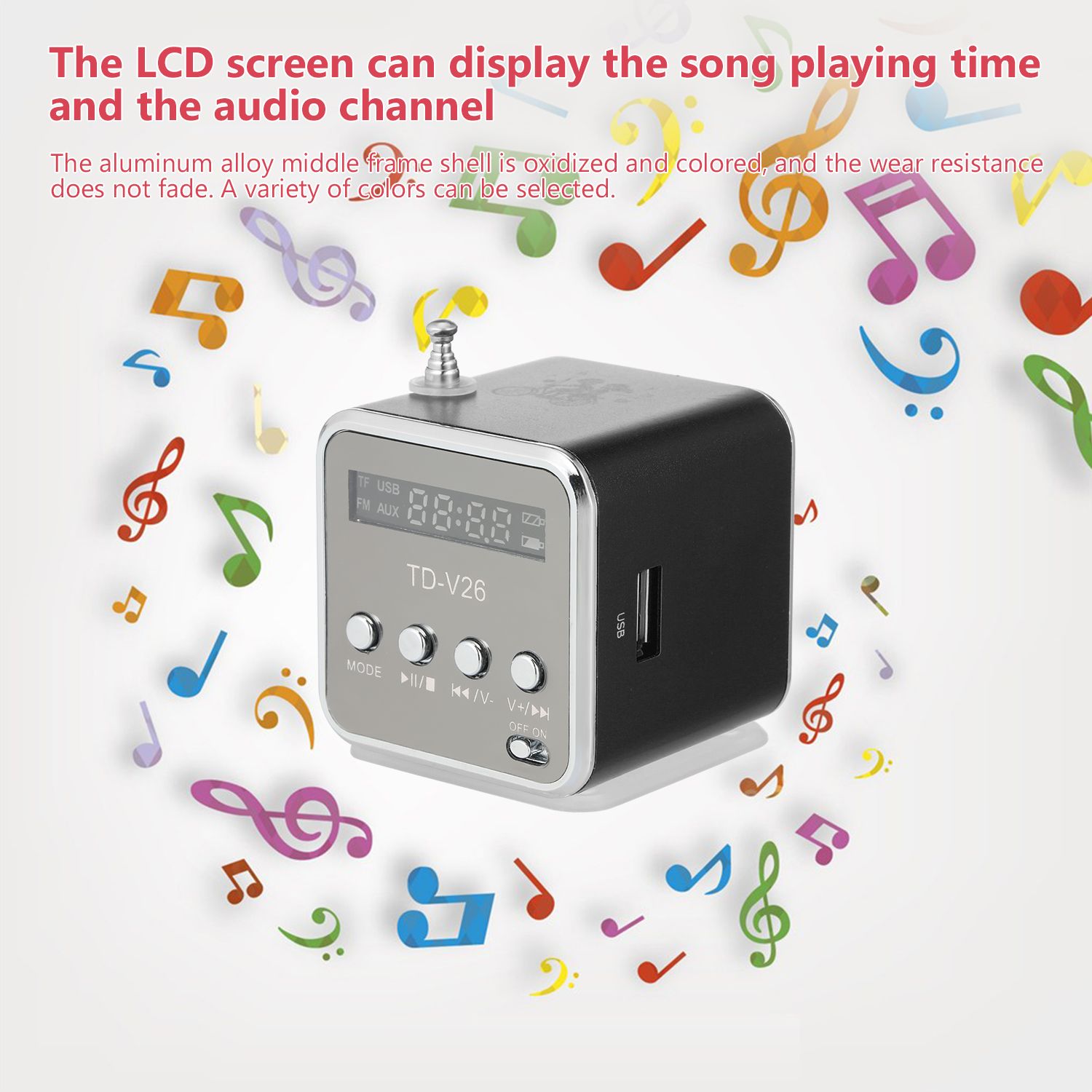 Overview:This mini speaker is available in multiple colors. You can insert a USB flash drive or a TF card for music playback. With FM radio and 3.5mm audio input and output.Features:It can insert TF card U disk to play MP3 format music with FM radio function.The LCD screen can display the song playing time and the audio channel.The aluminum alloy middle frame shell is oxidized and colored and the wear resistance does not fade. A variety of colors can be selected.Ultra-small size only 5.2*4.8*4.8cm mini portable.Simple and intuitive button design without complicated operations. A telescopic antenna with a received signal approximately 14.5 cm.Note:It can be used after 2 hours charging; (first time charging is for 7-8 hours)To connect one end of the audio cable to the audio output port ofcomputer or mp3 the other end to the back of the product. It can be used when turn on the player.Please use the USB charging cable of this product while charging itcan not be used as audio line.Make sureturn off the sound before charging. Normal capacity charge time is 2 hours please turn off the power after 2 hours.Specifications:Output power: 3W*2Frequency response: 200HZ-12KHZHumidity test: 90-95% RH 24HHeat test: -25 -- +75degreeRF: 220Hz20%S/N ratio: 85dB3dBColor: Rose red black blue silver yellow red (optional)FM: 87.0MHZItem Size: 5.2 * 4.8 * 4.8cm / 2.05 * 1.89 * 1.89inItem Weight: 111g / 3.92ozPackage Size: 6.8 * 6.2 * 5cm / 2.7 * 2.4 * 1.97Package Weight: 142g / 5ozPackage List:1 * Player1 * USB Cable1 * 3.5mm Cable
