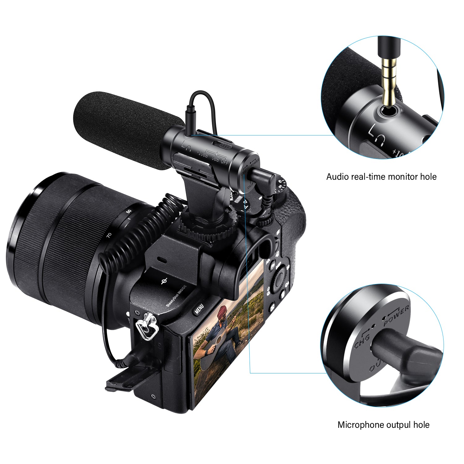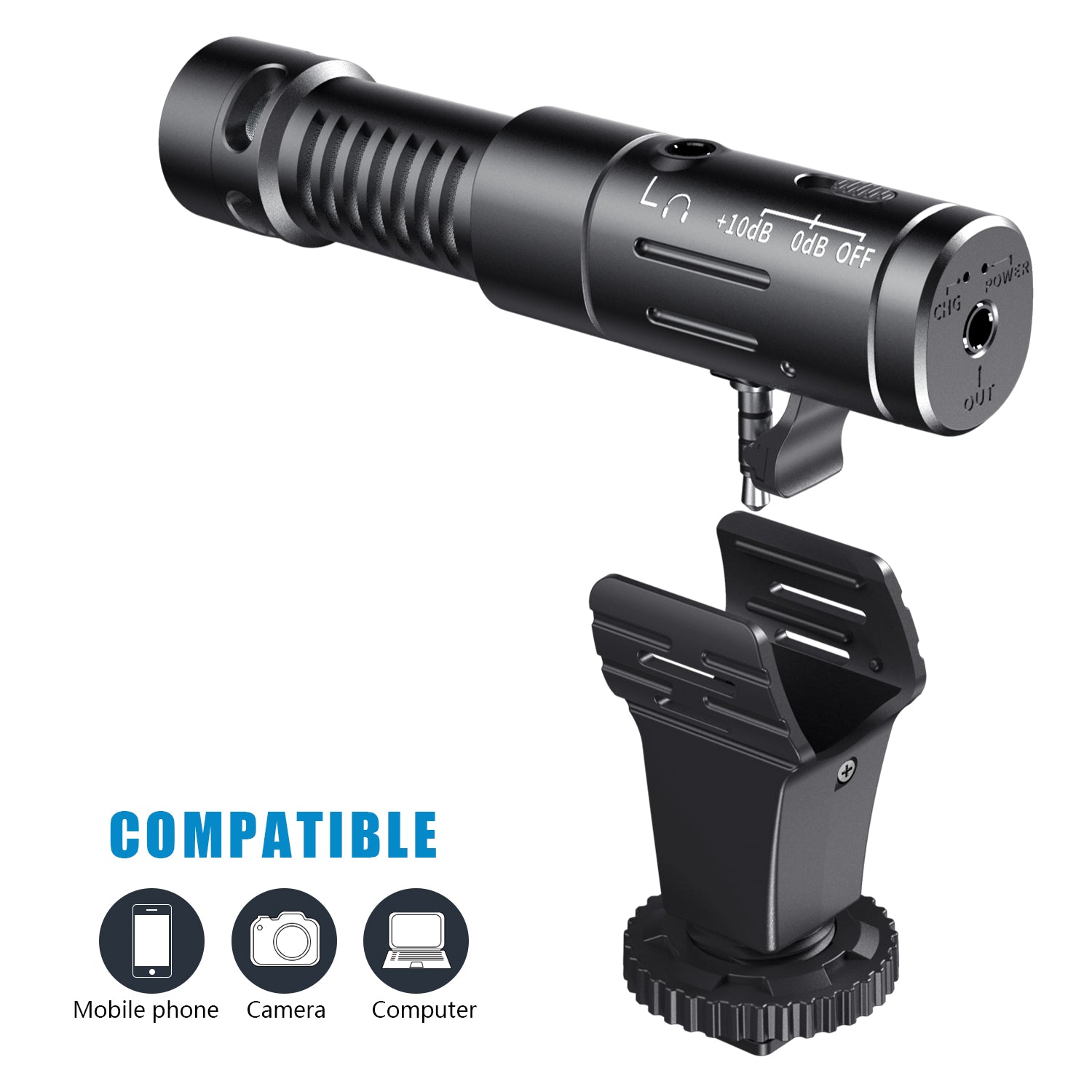 Highly sensitive, compatible, omnidirectional microphone with 3.5mm connector, secure the hot shoe on the camera to fully support device installation