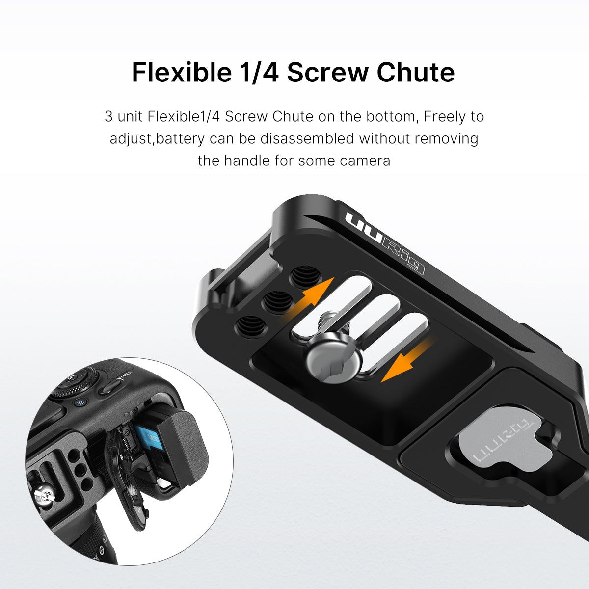 3 flexible 1/4 screw chutes at the bottom of the device, can be adjusted freely, and battery can be disassembled without removing the handle for some camera