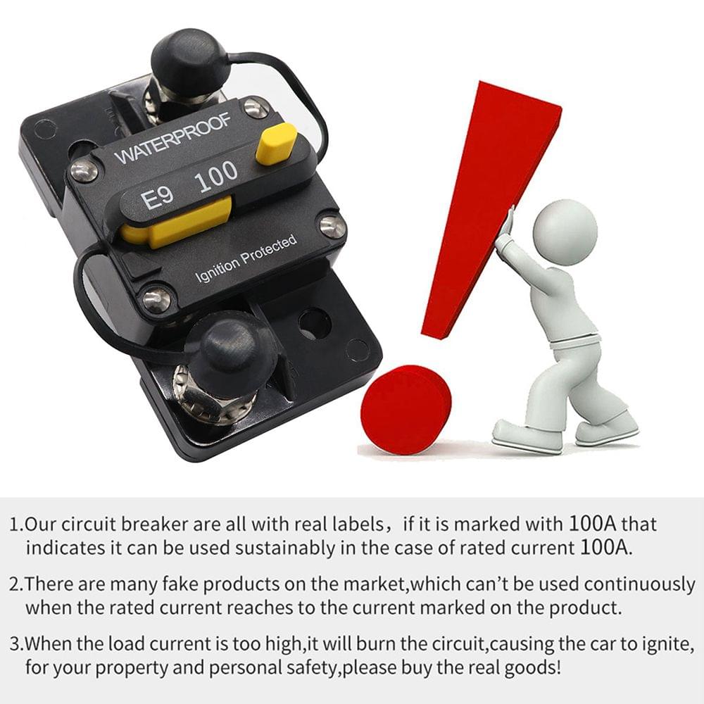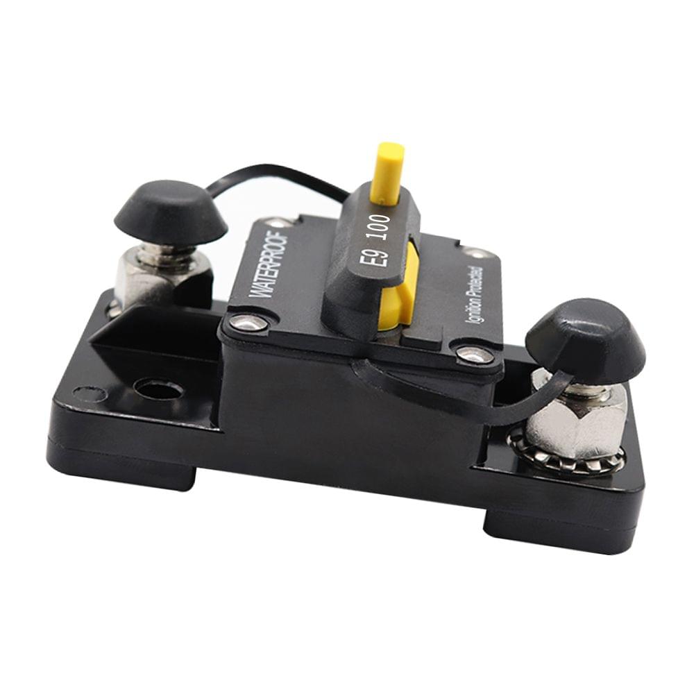 Features:This circuit breaker is designed to protect electrical appliances from excessive current safer for your life.Switch type easy to operate. Press once to disconnect simply push the yellow part back to reconnect very convenient.Don't need to take it down or to install fuse control it with just one hand.Made from alloy material of good electrical conductivity high temperature resistance; high tech water resistant housing IP67 waterproof.Typically used in DC systems in marine applications (as a main or branch circuit breaker ) truck bus and RV systems add-on protection for accessories.Specification:Rated Current: 100ARated Voltage: DC 72V maxInterrupt Capacity: 3000A @32 Vdc; 5000A@16Vdc; 3000A@32Vdc; 2000A@72VdcWaterproof Level: IP67Stud Size: 1/4-28Operating Temperature: -32C to 82 C (-25F to 180 F)Storage Temperature: -34C to 149 C (-30F to 300 F)Package Size: 8 * 6 * 6cm / 3.15 * 2.36 * 2.36inPackage Weight: 108g / 3.81ozPackage List:1 * Circuit Breaker