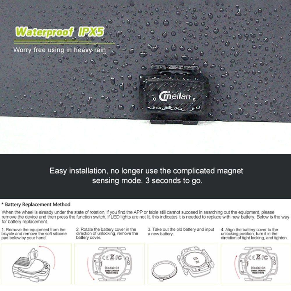 description":"The bike sensor provides data of speed and cadence when you ride spinning bike, can connect with riding APP by BT. The speed or cadence mode for you to select. Features: Using BT BLE4.0 and ANT+ dual-mode technology, it can connect with bike computer that conforms to standard BT protocol and ANT+ protocol. Cordless connect with riding APP and make data transfer, currently support for Wahoo, Cateye, Topeak, Teasi, Komoot, Falk, Meilan, Shealth APP etc. Using software intelligent algorithm, automatically measure speed and cadence; suitable for cycling or spinning in a gym. The device has a quick button, you can quickly select the speed or cadence mode, and there are two instruction lights corresponding to the different working conditions. Cadence with white light, speed with green. Using coin cell CR2032, easy replacement, it can be used about 9 months continuously. Waterproof IPX5, worry free using in heavy rain. Easy installation, 3 seconds to go. Specifications: Brand: Meilan Model: C1 Material: ABS Color: Black Waterproof: IPX5 BT Version: 4.0 Package Weight: 15g / 0.53ounces Package Size: 80 * 70 * 20mm / 3.15 * 2.76 * 0.79in Note: The device is one channel output, at the same time can only choose one of Speed or Cadence. Package List: 1 * Speed Sensor 2 * Rubber Bands